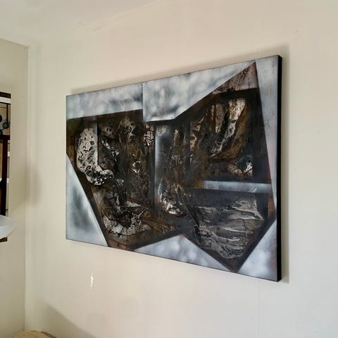 Abstrakt tavla i svart, vitt och grått med textur och textdetaljer. Motivet består av geometriska fält och block i olika nyanser, vilket ger en grafisk och modern känsla. Passar exempelvis i vardagsrum, sovrum eller hall som väggdekoration. Målad på duk uppspänd på ram, redo att hängas upp på väggen.