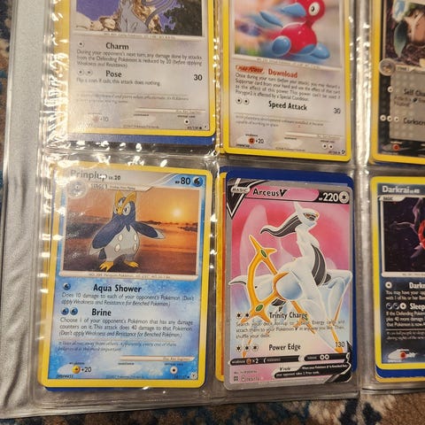 Pokémon samling med Pokémonkort i plastfickor. Blandning av vanliga kort och holo/foil-kort med olika Pokémonmotiv. Korten kommer från olika serier och expansioner och har varierande HP-värden, attacker och energikrav. Passar för samlare eller för den som vill utöka sin kortlek i Pokémon Trading Card Game. Bilderna visar exempel på några av korten i samlingen