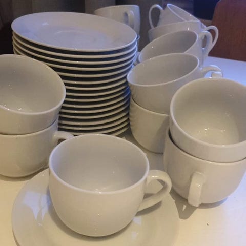 Seltmann Weiden Bavaria kaffekoppset i vitt porslin. Setet består av kaffekoppar med fat samt tillhörande delar som kanna och sockerskål. Klassisk vit servis i porslin, tillverkad i Tyskland, lämplig för servering av kaffe eller te vid vardag och fest.