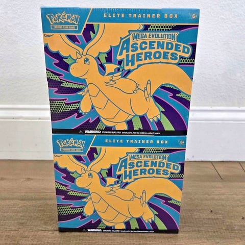 Pokémon Mega Evolution Ascended Heroes Elite Trainer Box samlarlåda. Boxen innehåller spel- och samlartillbehör för Pokémon Trading Card Game, såsom kort, energikort, markörer, tärningar och samlarlåda med motiv från Mega Evolution Ascended Heroes. För Pokémon TCG-spelare och samlare från 6 år och uppåt.