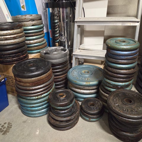 Två 6kg clubbells, en 8kg och en 15 kg. En 16kg Energetics kettlebell (täckt i gummi) och en 24kg Gymstick kettlebell.