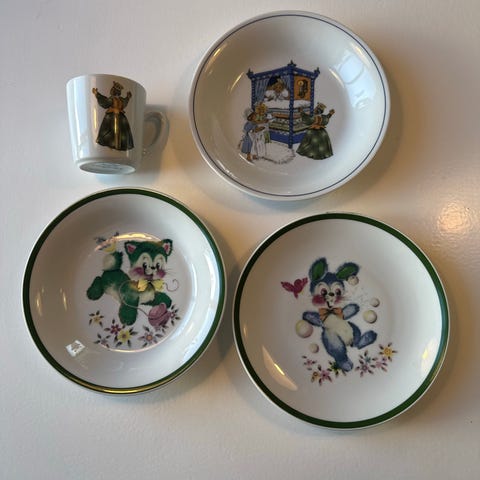 Väggtallrikar i porslin med fågelmotiv och blommor. Set om fyra runda tallrikar med olika fåglar på ljus bakgrund. Avsedda som väggdekoration, varje tallrik har upphängningsanordning på baksidan. Passar som prydnad i exempelvis kök eller vardagsrum. 50kr var, men tar man alla fyra kan man få de för 150kr