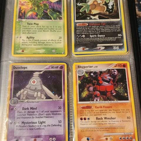Pokémon Trading Card Game samling kort i pärm. Bilderna visar en blandning av olika Pokémon-kort, inklusive baspokémon, utvecklade pokémon, energikort och specialkort. Korten förvaras i plastfickor i en pärm med Pokémon-motiv på omslaget. Lämpligt för samlare eller som utökning av befintlig kortsamling. Antal kort och specifika set eller utgåvor framgår inte fullt ut av bilderna och kan behöva kontrolleras vid intresse..