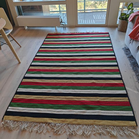 Kasthall Berghem matta med måtten 160x240 cm. Mattan har ett randigt mönster i beige och vitt med detaljer i blått och grönt. Vävd kvalitet som passar exempelvis vardagsrum, hall eller matplats.