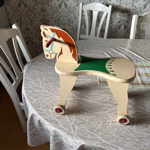 Charmig äldre gunghäst i trä med vacker patina och originalmålning i mjuka pasteller. Troligen 50–60-tal. Fin som både leksak och inredningsdetalj i barnrum eller som nostalgisk detalj i hemmet.
