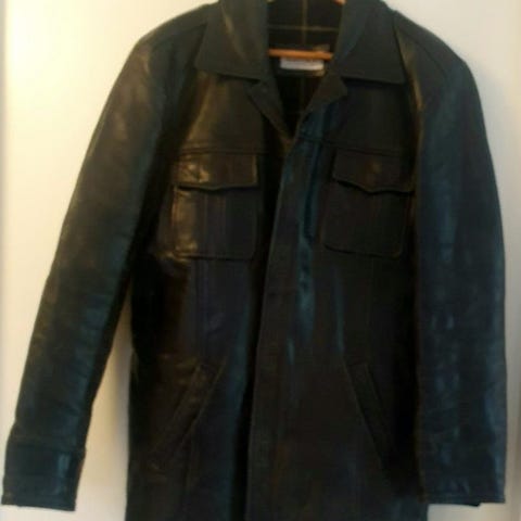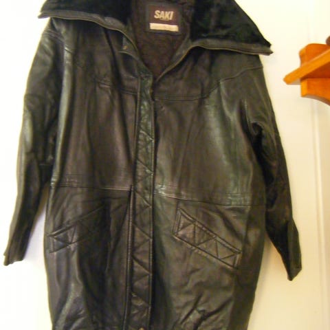 Brun läderjacka av märket Saki, stl 42. Dragsko i midja, 2 innerfickor, 2 bröstfickor med dragkedja och 2 öppna. Inga som helst fel på den och fodret är helt.
