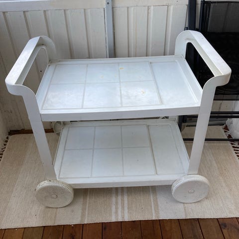 Stomme av lövträd, troligen ek, tillverkad i Sverige. Perfekt som bardisk, extrabord eller sängbord. Övre brickan löstagbar. På hjul av metall med gummidäck.. Kommer från mitt föräldrahem, tror detta var något som farsan skaffade sig på 60-talet. Eller om den möjligen är lite äldre än så. Möbeln är helt i ok skick med tanke på ålder, därmed finns spår av lätt slitage vilket överensstämmelse med vintageskicket, ålder och användning. Tror det är en vintage IKEA-möbel..