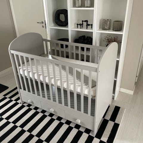 IKEA enkelsäng spjälsäng i vit färg. Klassisk modell med ribbade sidor runtom och träbotten. Passar som säng för spädbarn och småbarn. Madrass på bilderna ingår eventuellt beroende på överenskommelse. Lämplig att använda i barnrum som första säng.