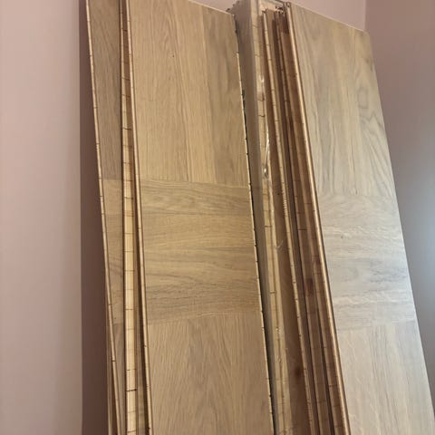 Tarkett Shade parkettgolv i ek, plankformat. Varje bräda är 185 cm lång och 13,4 cm bred. Total tjocklek är 13 mm med ett slitskikt på 2,5 mm.