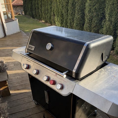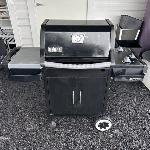 Weber Spirit gasolgrill i svart och grått utförande. Grillen har tre reglage för brännare på frontpanelen och arbetsytor i metall på båda sidor. Under grillen finns förvaringshylla och plats för tillbehör. Gasolflaska ansluts via slang och regulator på sidan. Passar för utomhusgrillning på uteplats, altan eller i trädgård.