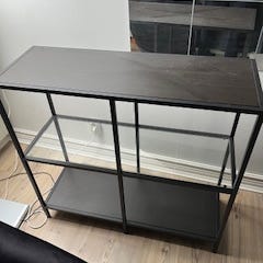 Sideboard i brun träfinish med två dörrar framtill. Dörrarna har dekorativa sniderier. Invändigt finns hyllplan och utdragbara lådor som ger plats för förvaring av exempelvis elektronik, porslin eller andra hushållsartiklar. Möbeln står på korta ben och har en plan ovansida som kan användas för att ställa TV eller andra föremål på.
