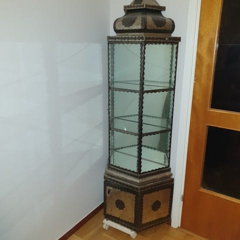 Glasmonter vitrinskåp med flera glashyllor och glasade sidor. Skåpet är högt och smalt med dekorativ ram runt glaspartierna och en fotdel med sluten förvaring. Passar för exponering och förvaring av samlarföremål, prydnader eller andra mindre objekt i hem eller butik.Vitrinskåp med en unik orientalisk design. Skåpet har glaspaneler och flera hyllplan för att visa upp föremål. Den nedre delen av skåpet har ett slutet förvaringsutrymme. Skåpet är en dekorativ möbel som passar i olika rum.2 delar hela h180.B 50 ÖVRE DELEN 140 UNDER 40 ALLA SIDOR ÄR BRA OCH MEN DET ÄR EN SPRICKA PÅ SPÅGELN INNEHÅLL INGÅR EJ. OM NI VIL FRAKTA DEN STÅR KÖPAREN FÖR FRAKTEN OCH PACKNINGEN