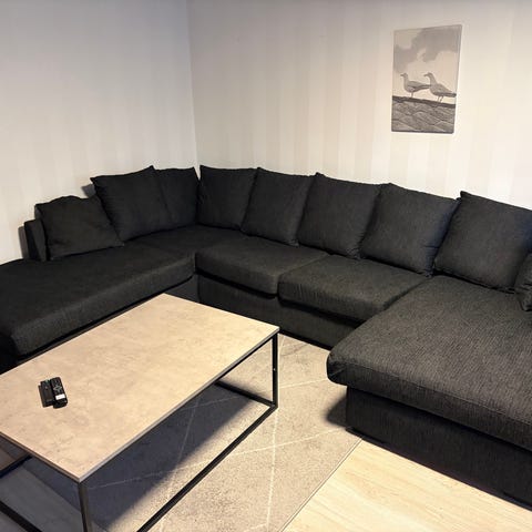 Grön soffa med avtagbar/tvättbar klädsel. Ekben. Divandelen är 210 cm och soffdelen 250 cm.