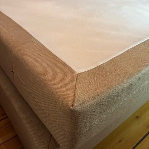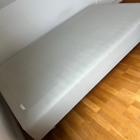 DUX säng med bäddmadrass. Sängen har träram och en ljus textilklädsel. Bäddmadrassen är i ljus färg med quiltat överdrag. Passar som enkel- eller gästsäng beroende på mått och behov. Lämlig för användning i sovrum eller gästrum.