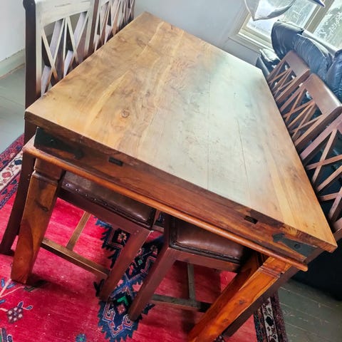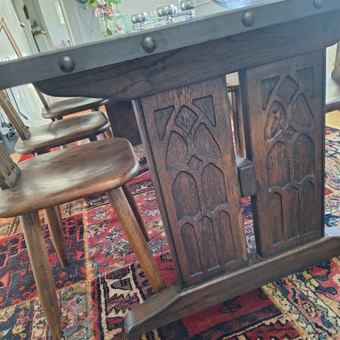 Matbord i mörkbrunt trä med rektangulär bordsskiva. Bordet har dekorativt snidade gavlar och massiva sidostycken som ger en stabil konstruktion. Träytan har synlig ådring och infällda trädetaljer i skivan. Passar som matbord i kök eller matsal och rymmer flera stolar runt om.