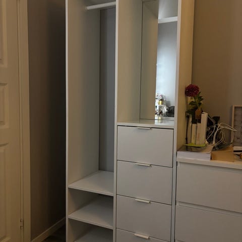 En klädhylla, lådor och öppna hyllor ger gott om lagringsutrymme.