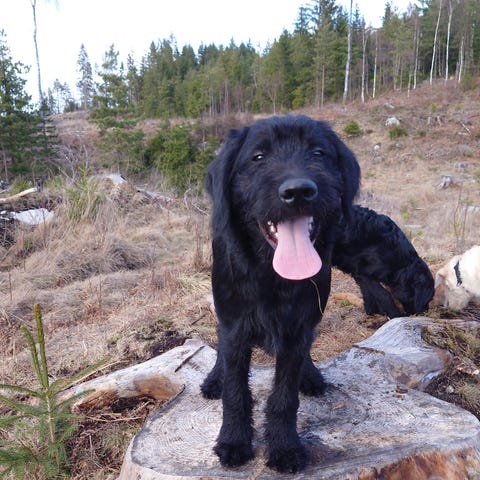Han är en underbar blandning av vår lugna labrador retriever och vår kloka kungspudel – en kombination som ger både trygghet, glädje och intelligens.