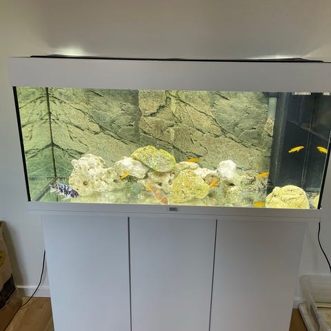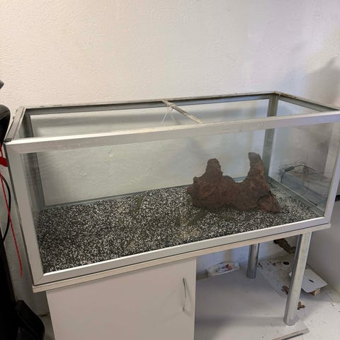 Akvarium i glas med metallställning. Rektangulär modell med belysning i locket. Akvariet är inrett med grusbotten och dekorationer samt används för sötvattensfisk. Passar för placering inomhus på golv tack vare det stabila stället i metall. Fiskarna ingår i akvariumet och det är 4 st.