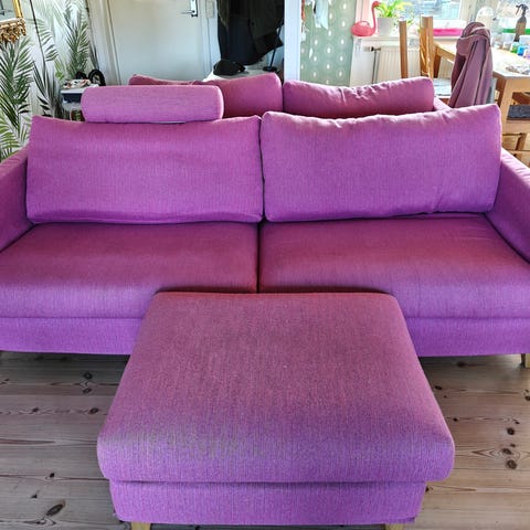 Soffan är i använt skick, men har mer att ge. Inga fläckar eller skador på tyget. Material: 100% polyester.