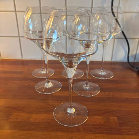 Vinglas i extra stark krystall, 35cl. 210mm höga. Har 4 st kartonger med 6 st vinglas i varje kartong. Ett fint glas som förhöjer vinets smaker. 200 kr per kartong. 750kr för alla kartonger.