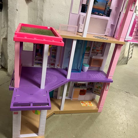 Barbie dockhus i plast med flera våningar. Huset har öppningsbara väggar, rum med inredningsdetaljer.