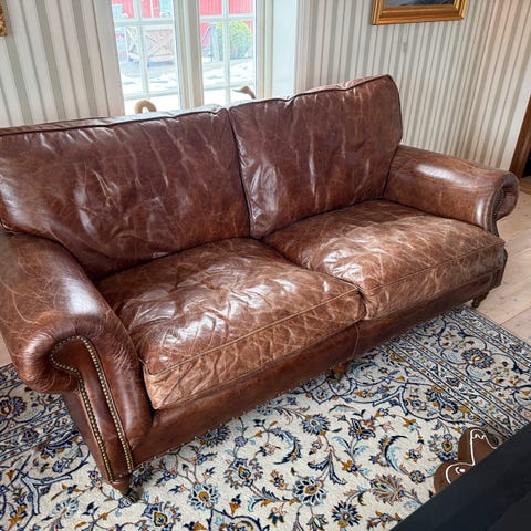 3- sitsig chesterfield soffa, i använt skick. Remmar och nättyg i botten har lossat en del och sitt kuddarna är i slitet skick. Skinn på baksidan är helt och armstöd, samt rygg runt om är också i fint skick. Fjädrar är hela och man sitter fint i den. Potential finnes.