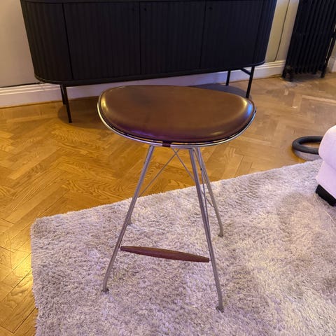 Matstol ”Giron” från Sol & Luna, med sits i mörkbrunt läder och underrede i stål, säljs bl a av Artilleriet, DIS inredning m.fl. Fantastiskt handarbete utfört av sadelmakare. Nypris idag 6700 kr
