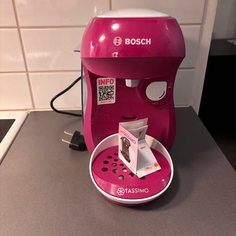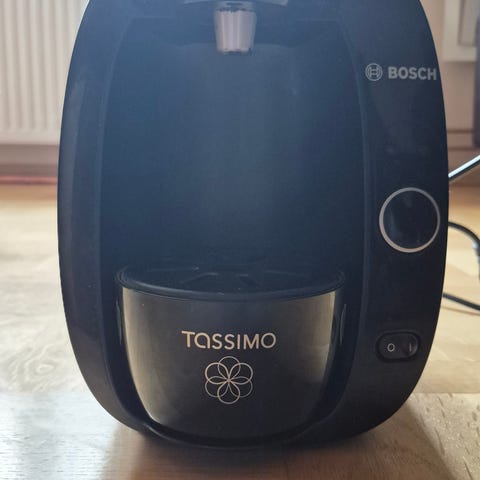 Bosch Tassimo kapselkaffemaskin i svart färg. Maskinen använder Tassimo-kapslar för att brygga enskilda koppar kaffe, te eller andra varma drycker. Utrustad med avtagbar vattentank på baksidan och droppbricka framtill. Passar för användning i kök eller kontor där man vill brygga en kopp i taget med kapselsystem.