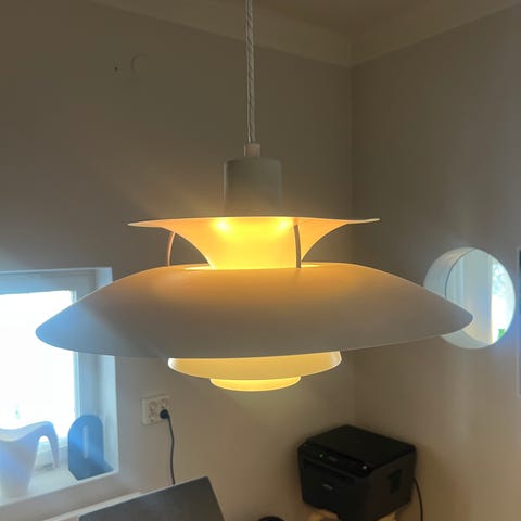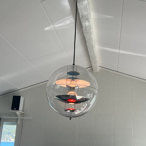 Säljer en klassisk VP Globe, designad av Verner Panton – en av dansk designs mest ikoniska taklampor. Lampan består av en transparent akrylglob med svävande reflektorskärmar i vitt och varma accentfärger som skapar ett mjukt, bländfritt och stämningsfullt ljus.