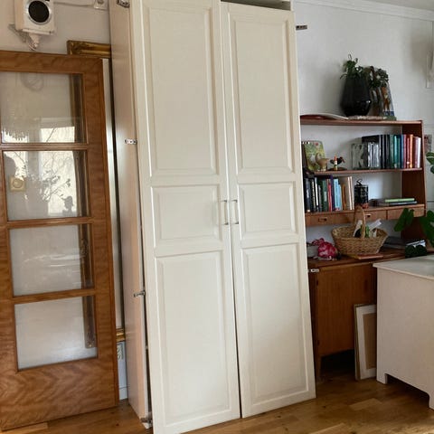 Generellt gott skick. Använd som hall-garderob. Baksidan är dock utskuren för termostat (se bild).