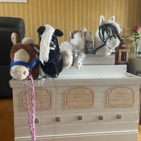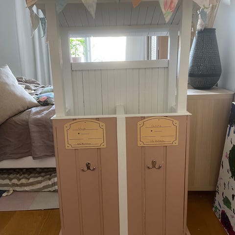 Krokar och extra förvaring enligt bild medföljer. Samt två käpphästar från Panduro.