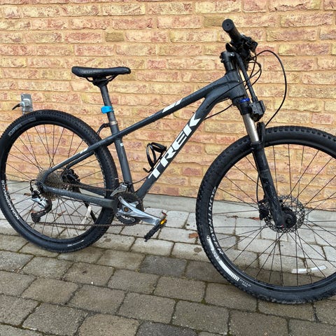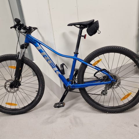 Trek Marlin 5 BMX cykel för herr med ramstorlek M och 29" hjul. Cykeln har hård framgaffel med dämpare, grovmönstrade däck anpassade för blandad körning samt raka styre med handbromsar. Utrustad med skivbromsar och flera växlar, vilket gör den lämplig för både vardagscykling och lättare terräng. Färg i mörk ton med Trek-logotyp på ramen. Sparsamt använd av oss, alltid förvarad inomhus. Nu har den stått en längre tid i källaren så däcken behöver pumpas.