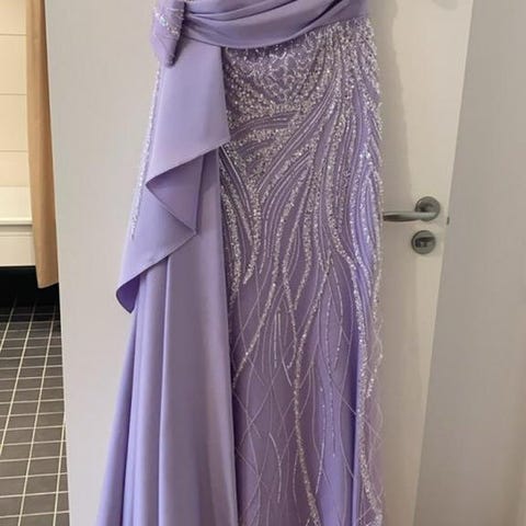Säljer min fantastiskt vackra lila festklänning i skimrande tyg med eleganta glitterdetaljer.