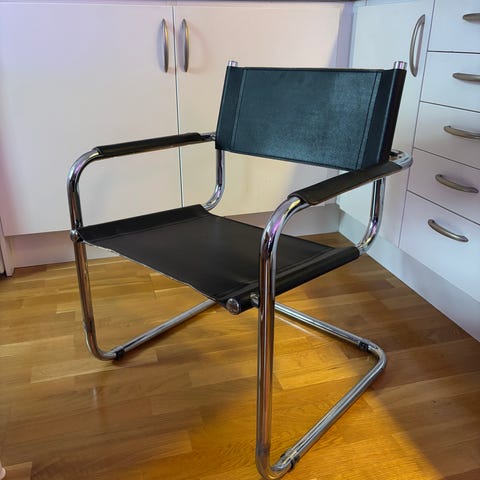 Fåtölj med stålrör i krom samt skinnsits