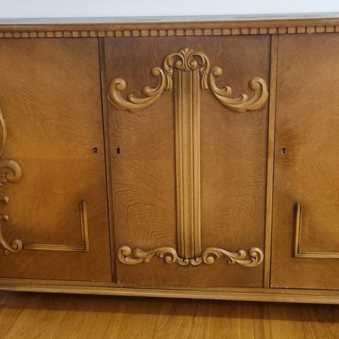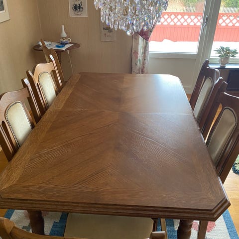 Matbord i ek + 2st iläggsskivor. Säljes separat eller tillsammans med 6st stolar och en stor skänk/byrå i ek i samma stil med gott om förvaringsutrymme för t.ex porslin, bestick eller linne