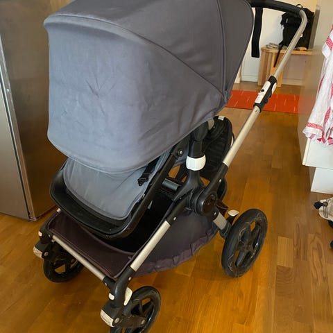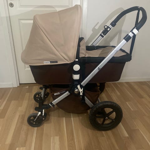 Bugaboo barnvagn med sittvagnsdel och liggdel. Vagnen har svängbara framhjul, större bakhjul och varukorg under sittdelen. Handtaget är justerbart och det finns bygel framför sittdelen. Liggdelens sufflett är i beige ton och sittdelen har en vadderad dyna. Passar för ett barn från nyfödd med liggdel och uppåt i sittdelen.