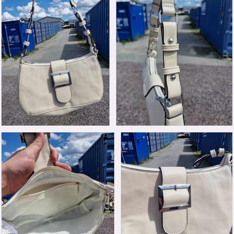 axelremsväska i vitt fuskläder för kvinna. Väskan har ett kort axelband och stängs med dragkedja upptill. Invändigt finns ett huvudfack med ljus textilfodring. Passar för vardagsbruk och för att bära mindre personliga tillhörigheter som plånbok, nycklar och mobiltelefon.
