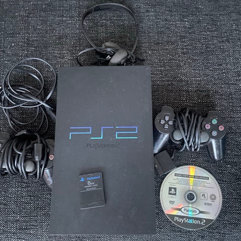 Sony Playstation 2 spelkonsol svart med handkontroller mikrofoner och spel