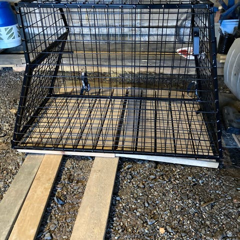 Hundbur i svart metall med gallerkonstruktion. Burens sidor och tak består av metallnät, och den har öppningsbar dörr framtill och på sidan. Kan användas för en eller två hundar då mellanvägg finns. Pris satt efter skicket på buren.