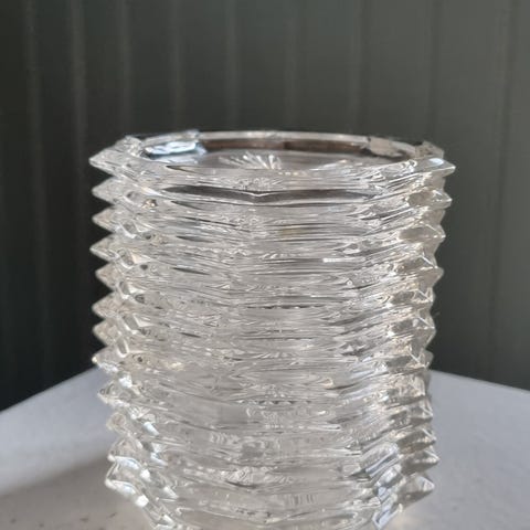 Pressat glas med ett geometriskt diamantmönster och en stjärnburstdesign i botten.