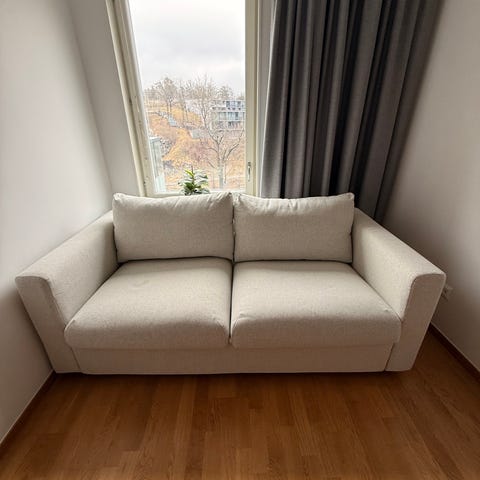 IKEA soffa 3-sits i beige tyg. Soffan har raka armstöd och lösa ryggkuddar. Bredden är cirka 241 cm enligt måttritningen. Sitthöjd, sittdjup och höjd inklusive ryggkuddar framgår av den bifogade skissen. Klädseln går att ta av för tvätt. Kommer från ett djurfritt och rökfritt hem
