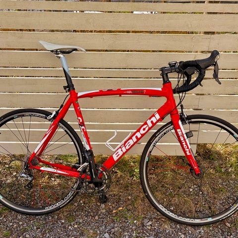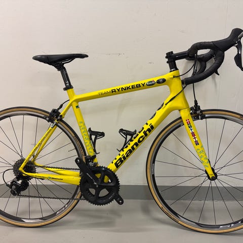 Som rubriken lyder så är det en Bianchi Vertigo 130 års jubileum med Shimano 105 växlings och bromssystem. Cykeln är i storleken 57 dvs L och har funkat bra för mig som är 188 men tror jag är i det övre spannet för denna storlek.