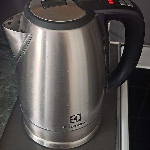Electrolux vattenkokare i rostfritt stål med svart handtag. Sladdans basenhet gör att kannan kan lyftas av för enkel påfyllning och servering. Passar för uppkokning av vatten till te, kaffe och matlagning i kök och hushållsmiljöer.