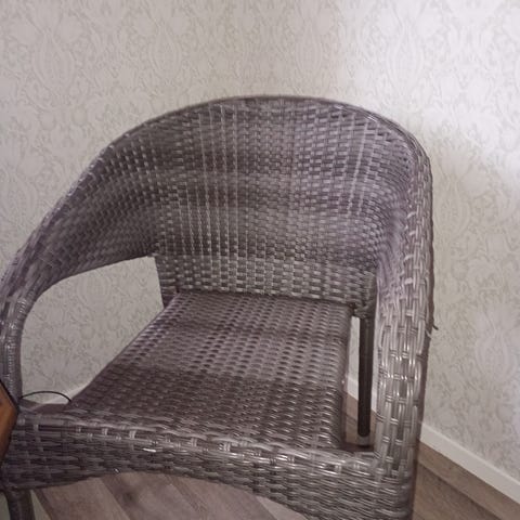 Rottingset bestående av en fåtölj och ett runt soffbord i naturfärgad rotting. Fåtöljen har ribbad rygg och armstöd samt lös sittdyna i neutral färg. Bordet har rund glasskiva med strukturerad yta och rottingunderrede. Passar som sittgrupp i vardagsrum, uterum eller på inglasad balkong.Band av på några ställen,men helt ok beg skick.