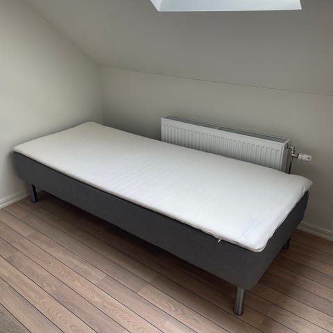 Säng i storlek 80x200 cm med grå resårbotten och vita ben. Ovanpå ligger en vit bäddmadrass. Passar som enkelsäng i sovrum, gästrum eller studentboende. Enkel, rak modell med neutrala färger som fungerar i de flesta miljöer. Vi har två stycken, pris per styck 250kr