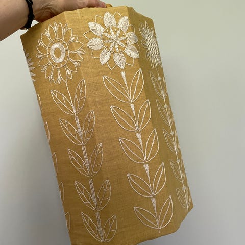 Säljer två antika lampskärmar i liknande sidentyg med guldkanter inhandlade på auktion i England. Den ena skärmen har en ring från en vattendroppe men det går bra att vrida skärmen så att den inte syns.