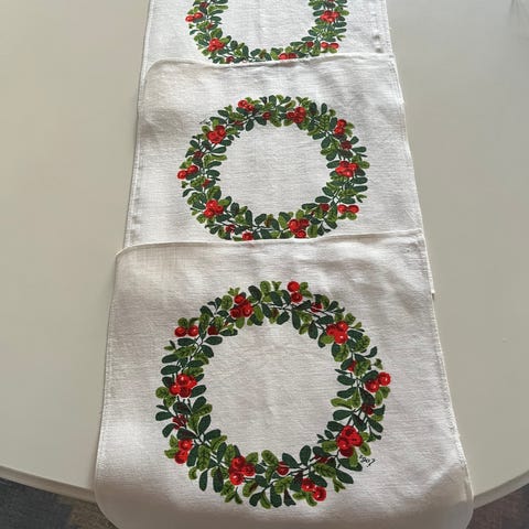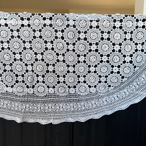 Virkade spetsband i mjuk orange färg. Spetsen har mönster med blommor och dekorativa kanter. Passar till dukar, gardiner, textilprojekt eller dekoration av kläder och hemtextilier. Materialet är virkade trådar, troligen bomull eller liknande garn. Inklusive duk 80/30 cm, handvirkade. Passar till påskbordet.