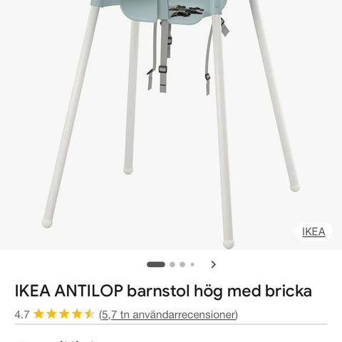 IKEA Antilop matstol för barn. Hög stol i vit plast med avtagbar bricka framtill och ben i metall. Sittdelen är slät och lätt att torka av. Medföljer lös sittdyna i textil med mönster, som ger extra stöd och komfort för mindre barn. Tyget går att tvätta. Benen är avtagbara för enklare förvaring och transport.
