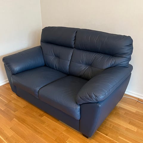 Fin mörkblå/svart skinnsoffa i tidlös design som passar perfekt i mindre vardagsrum, studentlägenhet eller kontor. Soffan är stadig och skön att sitta i, med mjuka dynor och bra ryggstöd. Den tar liten plats men rymmer ändå två personer bekvämt.