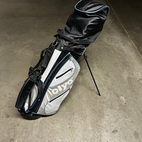 Cobra golfbag standbag i mörklila och gul färg. Väskan har bärremmar för att kunna bäras på ryggen och utfällbara ben så att den kan stå stadigt på marken. Flera fickor för förvaring av golfbollar, tillbehör och personliga saker. Öppningen upptill är indelad i flera fack för att separera klubborna.